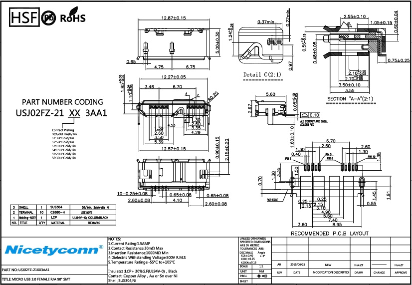 1. Micro USB 3.0 mm 90 Degree SMT Female Connector