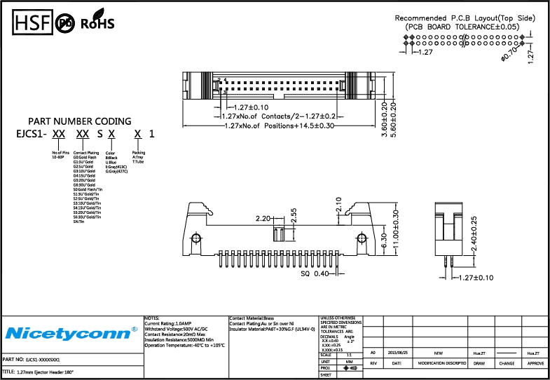 1. 1.27 mm Pitch 180 Degree Ejector Header